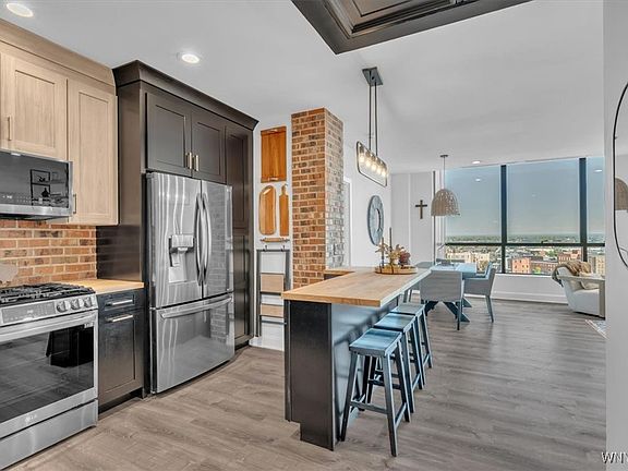 Perfection is the one word to describe this fabulous, 9th floor, City Centre condo. Enjoy urban living in this move in ready, 2 bedroom, 2 full bath condo that has it ALL! Modern urban interior design is featured throughout this 2024 renovated condo that includes: Kitchen: new cabinets, brick backsplash, new appliances, solid birch countertops, and prep island with seating. Primary bathroom: double vanity, new tiled shower with light up niche, frameless glass door, walk-in closet and custom cabinet for linen storage. Secondary bathroom: new tile, frameless glass shower door, new sink, custom cabinet for linen. Enjoy the beautiful Buffalo skyline views out of every window. 24 hour onsite concierge. The heated garage offers one assigned parking spot which is closest to the building entrance. Walking distance to Shea's theatre district, Frankie Primo's, Buffalo Chophouse and the waterfront. Exercise at NexGen Fitness at Fountain Plaza, walk to Spot and Starbucks, area banks and hotels. Outside the main door is Metro Rail that will deliver you to just about anywhere. City Centre is Buffalo condo living at its finest! Monthly HOA includes heat and water! Dogs and cats allowed!!