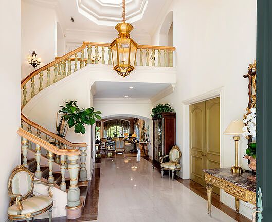 Park-like propertyShimmering pool and spaStately staircasePrivate balconyProfessional-grade tennis courtSecluded yardSpacious motor court