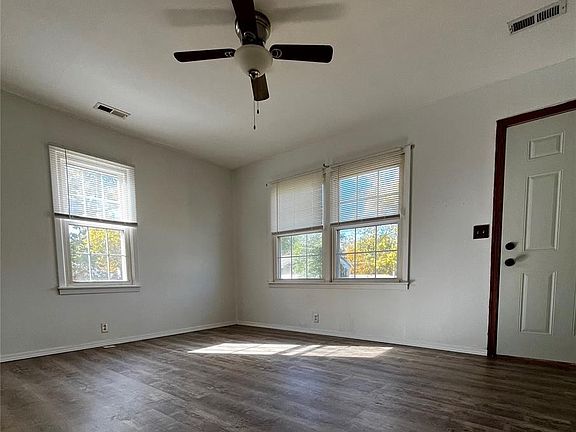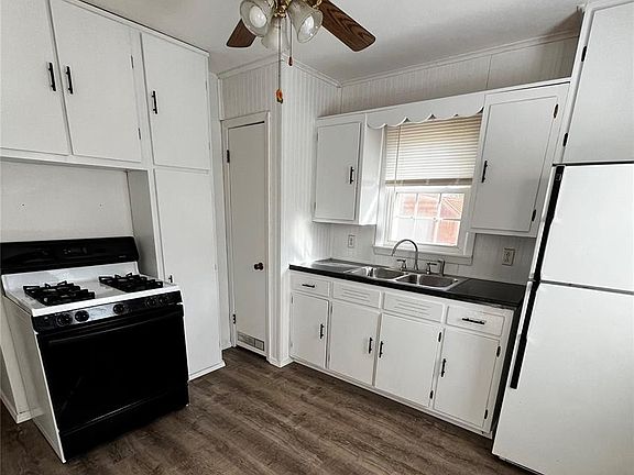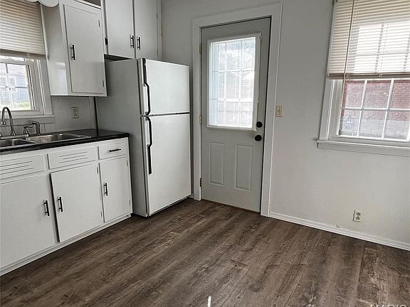 The kitchen comes equipped with a gas stove and refrigerator, and the original kitchen and bathroom cabinets have been freshly painted. New shades throughout the home add a clean, modern touch.