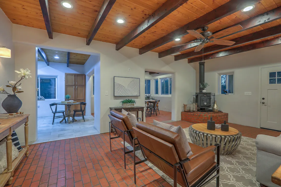 Separate living quartersThick adobe wallsModern bathroomBrick flooringPrimary bedroom suiteSoaking tubCovered patio