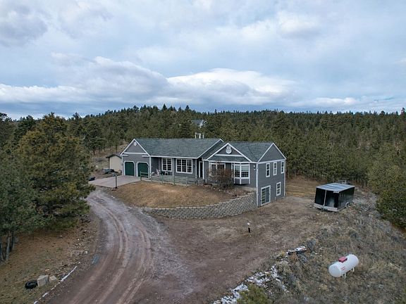 The main floor includes a spacious primary suite with a private deck, two additional bedrooms, a full bathroom, and a laundry room with another full bathroom, while the walkout daylight basement adds two more bedrooms, a full bathroom, two living spaces, and a cozy wood stove. Warm up by any of the three wood-burning fireplaces; upstairs, downstairs, and even one in the kitchen! Outside, the circular driveway wraps around a large rustic, country-style firepit made with boulders and reclaimed wood, creating a setting straight out of an old Western movie and perfect for evening gatherings and stargazing. The property is fully set up for animals with a feed and tack shed featuring electricity and an automatic watering system, older pens and storage areas, a loafing shed, and chicken coops. Enjoy the convenience of an attached two-car garage with a large storage shed/workshop located just off the garage, perfect for tools, hobbies, or extra storage.