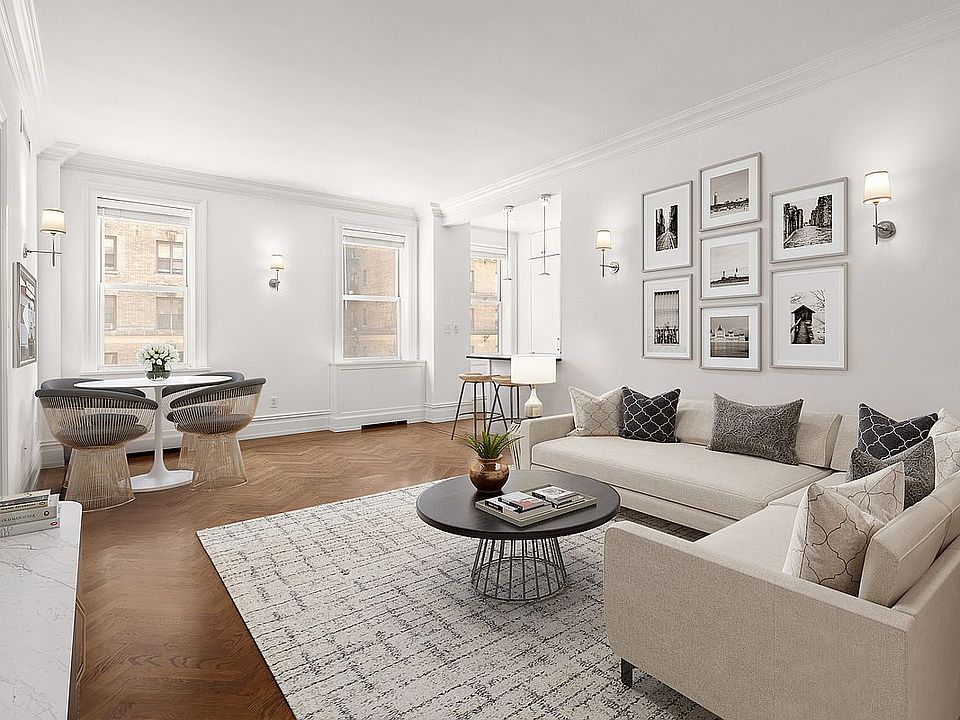 Discover timeless elegance in this exquisite 886-square-foot Prewar one-bedroom condominium, where classic prewar meets modern luxury. Nestled in the heart of the Upper West Side, this meticulously maintained home boasts a wealth of luxurious features including every room enjoying open views with incredible light all day, entry foyer, central air conditioning, Bosch washer and dryer within a huge walk-in closet, new solid oak herringbone floors with inlaid borders, new custom window blinds on every window, high ceilings and 5 exceptional closets, 4 of them custom fitted walk-ins.