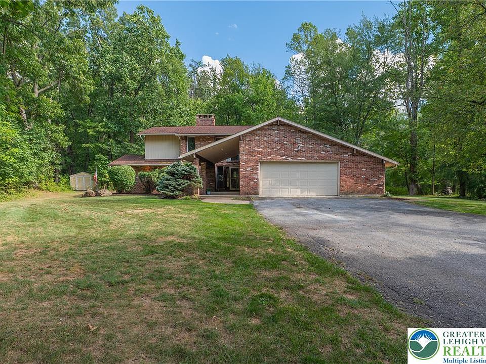 Experience privacy and convenience in one stunning setting. Get ready to fall in love with this rare gem of a property, nestled on a 2.9-acre wooded lot within the Borough of Emmaus and East Penn School District. Follow the private drive to your own sanctuary featuring 3 bedrooms, 2.5 bathrooms, and more than 2,700 sf of living space. This custom-built single-owner home features mature landscaping, a covered front porch and covered rear patio, and is surrounded by trees for privacy. Delight in the brightness as you enter the hardwood foyer and see the natural light streaming through the multitude of windows in this contemporary home. The sunken family room has unique design features—from a statement brick fireplace to the French door access to the patio and a cathedral ceiling. The dining room with access to the large, covered patio flows seamlessly into the spacious eat-in kitchen. The first-floor primary suite and laundry room provide the convenience of one-floor living. Another full bath and two more sizable bedrooms—one with a walk-in closet or flex space—round out the second floor. A full basement is plumbed for a bath and is ready for finishing or to use as storage. The oversized garage and expanded parking pad provide plenty of off-street parking. Enjoy the walkable community with shops, restaurants, a farmer's market, schools, and parks all close by.