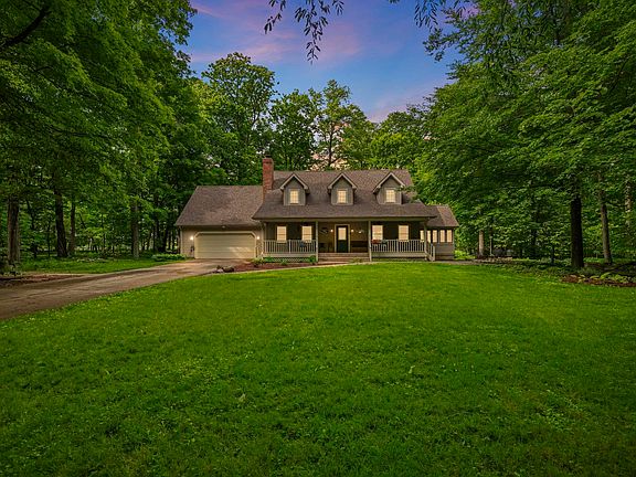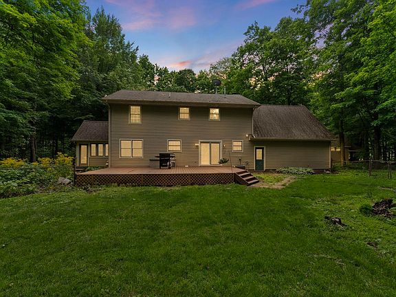 Welcome to your own private retreat! This beautiful 2-story home with a partially finished full basement is perfectly situated on 5 mostly wooded acres—offering privacy, tranquility, and room to explore. Inside, you’ll find freshly painted walls, refinished wood floors, a cozy gas fireplace, and a newer HVAC system with an air purifier for year-round comfort. Enjoy the stunning heated cedar sunroom, new sliding doors, a spacious deck, and a stamped concrete patio ideal for outdoor entertaining. The attached garage is complemented by a heated and cooled detached garage/workshop with 240-amp service and a full second floor—perfect for hobbies or additional storage. Additional upgrades include a newer water heater, new water softener, and a 60-amp EV outlet for electric vehicle charging. Whether you’re relaxing on the porch, exploring the woods, or enjoying the peaceful setting, this home offers the perfect blend of nature, comfort, and functionality. Truly a must-see property!