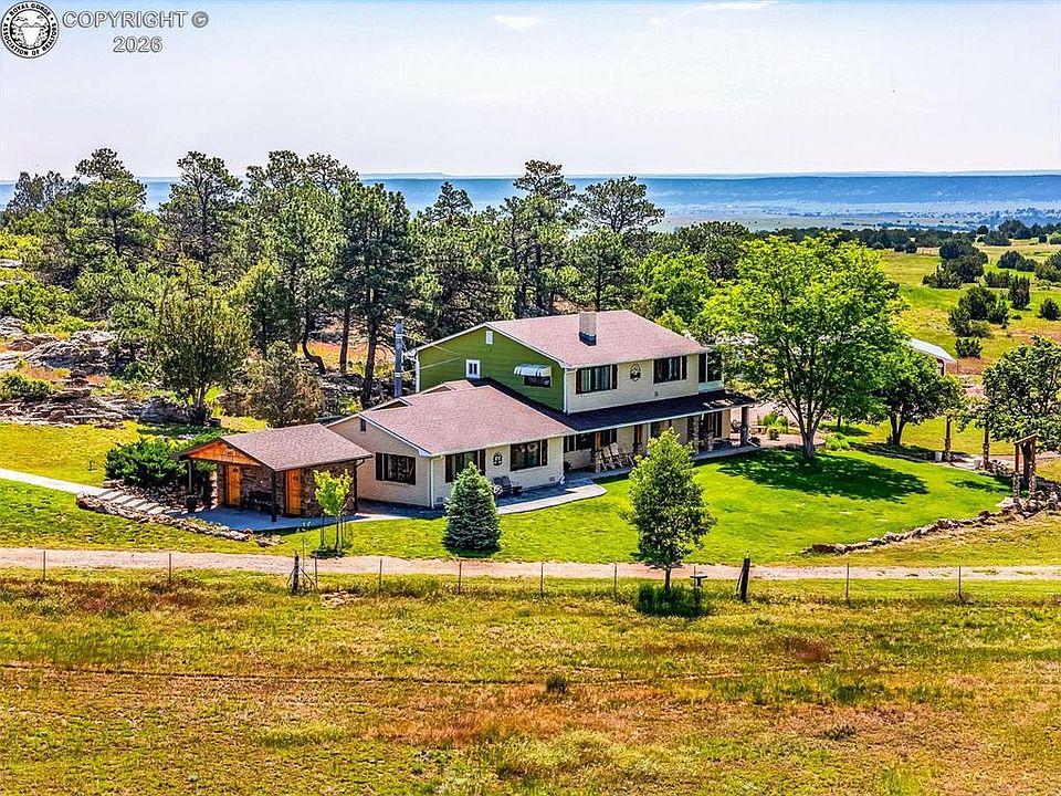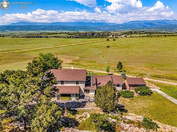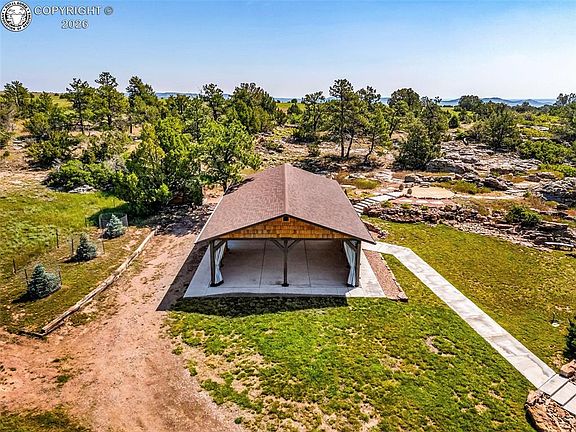 Discover this FURNISHED 3,500 sq ft home with 5 bedrooms and 6 baths (including a cozy bunkhouse) set on 80 or 160 acres(1.3Million) picturesque, fenced acres just 25 miles southwest of Pueblo. The main level offers expansive living space with a warm family room featuring a rock-wall wood-burning fireplace and breathtaking mountain views, a second inviting living room, two bedrooms, two bathrooms, and a laundry room. The gourmet kitchen includes granite countertops, custom cabinetry, and stainless appliances, opening into a dining room with a second wood-burning stove and an adjacent family room—easily convertible to a main-level master bedroom with a sliding barn door. Upstairs, the luxurious master suite includes French doors to an enclosed sunroom with a dry sauna, a spa-like ensuite bath with a soaking tub, steam shower, bidet, and walk-in closets. An office and additional bedroom complete the upper level. The home is surrounded by stunning rock formations, fragrant ponderosa pines, and unobstructed views of the Wet Mountains and snowcapped Greenhorn Mountain. Wildlife abounds, with frequent visits from deer, elk, and hummingbirds. Additional features include an attached 2-car garage, a detached 2-car garage with storage and workbench, a charming bunkhouse that sleeps 4 with kitchenette and half bath, a breathtaking moss-rock pavilion with custom lighting and a stage ideal for weddings or large gatherings, and a fully functional barn with tack room, hay storage, two stalls, grooming area, and pipe corral fencing. High-speed internet (250 Mbps) is installed, and the property has operated successfully as an Airbnb and wedding venue, offering optional business potential. Many couples have been blessed to exchange their wedding vows in this peaceful paradise. An additional adjoining fenced 80 acres is available for $210,000. A total of 160 acres for $1,300,000. Come explore the possibilities.