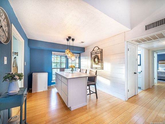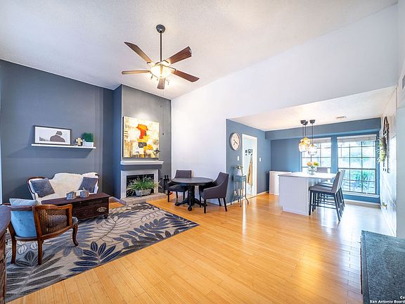 Beautifully remodeled condo located in the gated community of The Village at Woodlake, just minutes away from Randolph Air Force Base, Loop 1604, and I-35! This condo features a spacious, open floor plan, a wood burning fireplace, and high ceilings make it open and bright. The large master bedroom features a private balcony, skylights, and dual closets. Separate dining area with access to additional balcony with a beautiful pool view. Fees include water, trash, exterior maintenance, insurance, and pest control.