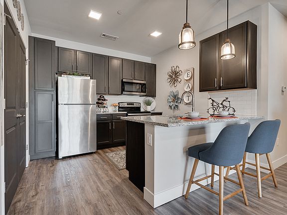 The one bed, one bath, 783 sqft Metro apartment homes at Grand Central feature top-of-the-line conveniences and premium fixtures/finishes. Cook homemade meals in your fully-equipped kitchen featuring stainless steel appliances, granite peninsula countertops, subway tile backsplash, spacious contemporary cabinets, and your own pantry. Plank wood-style flooring throughout your home brings a sophisticated vibe and provides durability for your four-legged roommates. Bathrooms feature granite countertop vanities and backlit mirrors. Additional amenities in your apartment home include a full-sized washer and dryer, private patio or balcony, ceiling fans and lighting in every room, large walk-in closets, and instant fiber-connected internet availability. Select units feature views of the communities pool, volleyball courts, and garden pool.