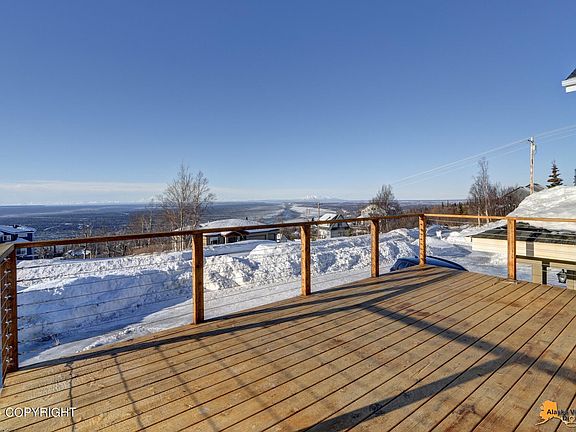 Gorgeous & sunny Hagmier home built in 2015 w/absolutely stunning, unobstructed views! Wonderful privacy & peaceful setting, located at the end of a cul-de-sac and featuring an open floorpan & wrap-around deck that takes full advantage of the views. Great room featuring custom built-in cherry cabinetry surrounding a central fireplace & perfectly placed windows to maximize the sunlight...The gourmet kitchen is elevated & features a center cooking island complete with bar seating & a six-burner Jenn-Aire gas cooktop. Glass tile backsplash, porcelain apron-sink, SS Jenn-Aire appliances and roll-out drawers & custom cabinetry complete the space. The kitchen is open to the dining room which also overlooks the great-room area & also offers direct access to the wrap around deck. The primary suite, featuring a spacious ensuite bath with two separate vanities, separate shower and jetted tub plus walk-in closet is located on the upper level along with 2 secondary bedrooms, another full bath with quartz counters as well as the laundry room. The lower level features a lovely family room with gas fireplace, a full bath with quartz counters and a 4th bedroom perfect for guest space, PLUS & huge recreation area that is large enough to be both a home gym and a home theatre with a rough-in wet-bar area...this area offers so many possibilities! The 1.52 acre lot offers plenty of space for storage of all the Alaskan toys! A large RV pad already exists and the driveway is easy to navigate! Come home to 6101 Greece Drive today and enjoy all that Hillside living in Alaska has to offer!
