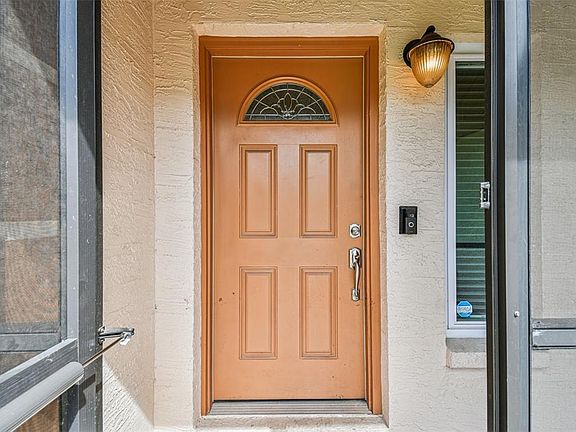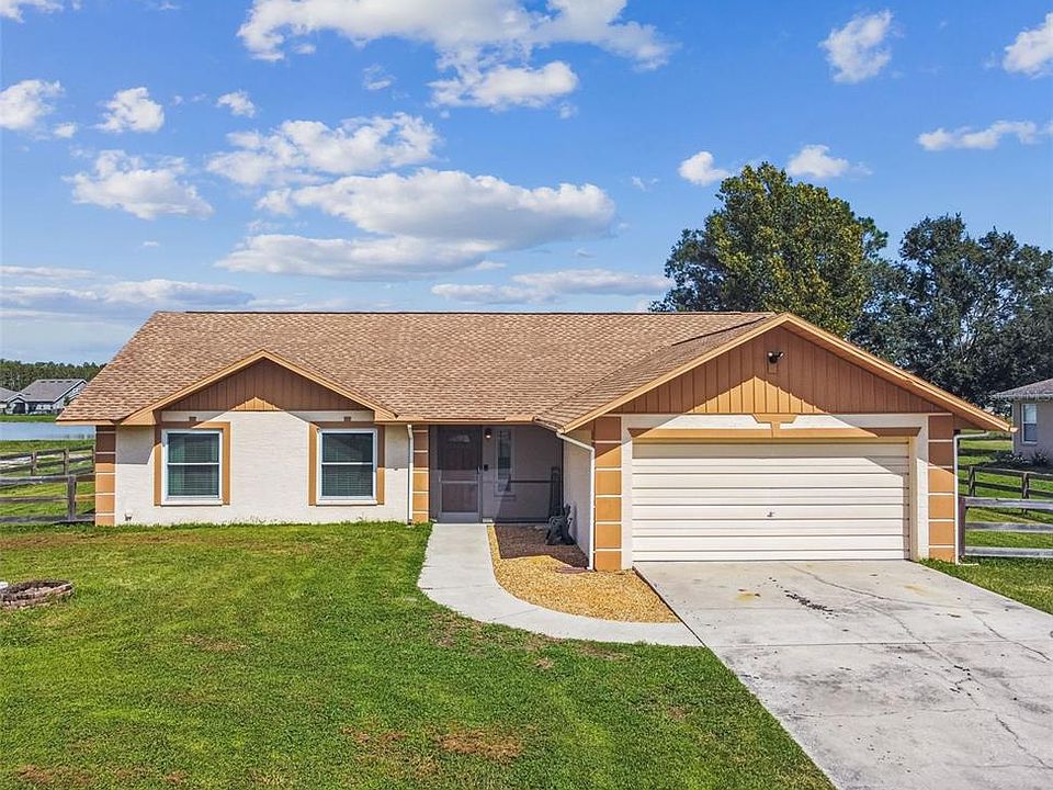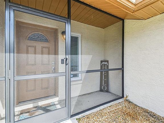 Move in ready Pool Home on Over Half an Acre – No HOA or CDD! This beautifully maintained 3-bedroom plus den, 2-bath home has 1,558 square feet of living space,a two car garage, and sits on an oversized .58 acre lot with pond views. Through the screened front porch, you will enter your open concept living space with vaulted ceilings and triple slider glass doors with unobstructed pool and yard views. The kitchen opens to the living area and features maple colored wood cabinets with ample storage, tile counters and backsplash, and an eat in dinette area with large window. The spacious primary suite offers crown molding, door for pool area access, dual walk-in closets, and en-suite bath with a jetted tub and separate floor-to-ceiling tiled shower with multiple shower heads. The den/office with French doors is a great additional space for work or relaxation. Two additional nice sized bedrooms and a full bath complete the space. The large screened-in pool area features a covered area for seating and paver tiles. The oversized fenced backyard includes a firepit and backs to a pond for a serene view. Some of the many updates of this home include NEWER ROOF (2019), NEW AC (2023), and WINDOWS (2018). This property is located minutes to Krate at the Grove and additional shopping, major highways, movie theaters, restaurants, hospitals, and more. Come see this home today!
