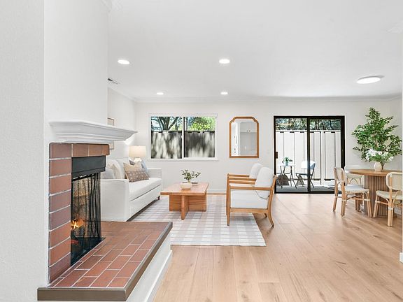 Step into a warm and welcoming living room centered around a classic brick wood-burning fireplace, perfect for cozy evenings. The space is enhanced by new dual-pane windows that flood the interior with natural light while improving energy efficiency. The kitchen features durable tile countertops and seamlessly connects to the dining and living areas, creating a harmonious flow throughout the home. Manufactured wood flooring adds a touch of elegance and continuity across the main living spaces. Retreat to your private back patio, an ideal spot for morning coffee, weekend barbecues, or simply unwinding outdoors. An attached one-car garage provides secure parking and additional storage space, enhancing the home's functionality. Located just minutes from the beach, this townhome offers easy access to a variety of restaurants, a nearby health club, and shopping centers, ensuring that everything you need is within reach.