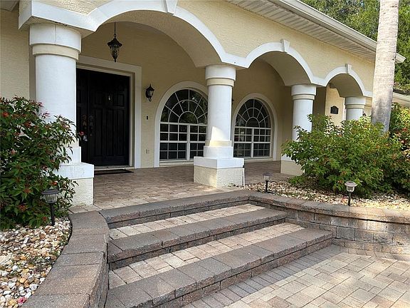 You will be amazed at the features this 2400+square foot home has at a price under 400K!!! The curb appeal screams FIRST CLASS with a huge brick circular driveway sweeping up to a stately raised front porch, double door entry and oversized 2 car garage. Upon entering the home, you will be amazed at the huge Living, Dining and entertaining areas. There are three large bedrooms, four updated bathrooms, a home office/Bonus Room. Two of the bedrooms are owner suites with one ideally set up for an in-law suite featuring a private entrance to the back yard courtyard. The Kitchen is completely updated and upgraded with newer cabinets granite counters, and new stainless-steel appliances. Don't miss the views from the kitchen of your 29-foot-long screen enclosed lanai leading out to the humongous back yard with freeform, in-ground, solar heated, saltwater pool with paver deck and raised wood deck with covered eating area and covered outdoor kitchen. Bring your green thumb if you wish because the homesite also includes your very own greenhouse, along with an attached she shed and a brand new 10x20 work shed all located in your fully fenced, double gated back yard where privacy abounds!!! Recently replaced items include Solar hot water heater, well pump, new septic field and new whole house water filtration system.