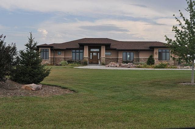 You will not believe the detail in this over 2400 sq ft ranch home! From the moment you drive up, the beautifully landscaped berms welcome you to a grand entry complete with a huge covered porch and circle drive. Step inside to the grand foyer with white oak floors inlaid with beautiful design opening to the dining room, living room and kitchen. See the detail in the oak columns and the built-in's which are all custom and over- the-top amazing(not to mention very useful). Stone fireplace & eat-in kitchen bar. Kitchen complete with granite, all stainless steel appliances including double ovens and a gas cooktop. The booth style breakfast nook opens to a huge covered deck overlooking Yankee Hill Lake to the east. 5.5 acres of astoundingly beautiful acreage living(horses allowed). 36x54 outbuilding complete with electricity and an overhead door. Additional features include a huge laundry room, additional two bedrooms on the main level and a finished walkout basemen