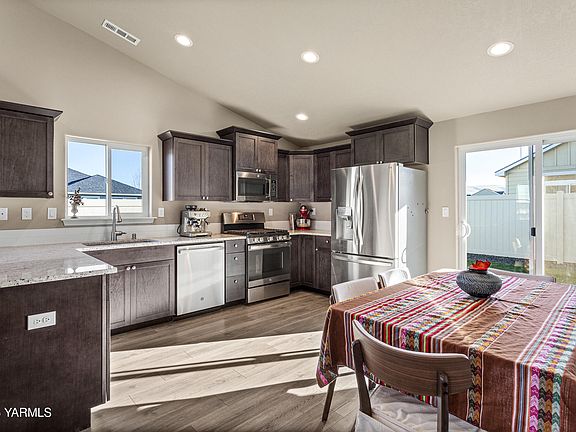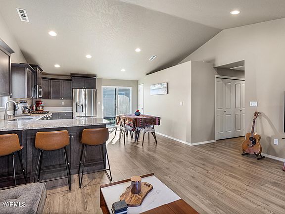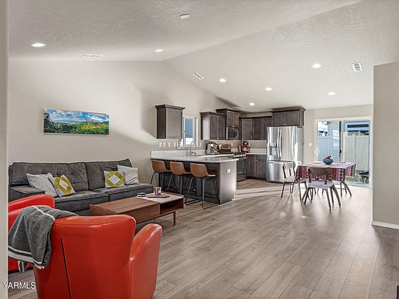 Welcome home to this 2023, better-than-new West Valley gem! Thoughtfully designed, this 3-bedroom, 2-bath home feels remarkably spacious with 1,152 sq ft of well-used living space. Step inside to a welcoming foyer that opens into the light-filled great room, featuring vaulted ceilings and upgraded vinyl plank flooring. The open-concept layout seamlessly connects the living, kitchen, and dining areas--perfect for everyday living and entertaining. Enjoy meals in the eat-in kitchen or at the expanded peninsula with eating bar. The kitchen is complete with a gas range, LG stainless steel refrigerator, upgraded cabinetry and granite countertops, and a pantry for extra storage. A sliding door leads to the covered back patio and fully fenced backyard, ideal for outdoor dining or weekend BBQs.Down the hallway, you'll find a convenient laundry area with an LG washer and dryer included. The private primary suite comfortably fits a king-size bed and includes a full ensuite bath. Two additional bedrooms and a second full bath complete the layout.Built in 2023 with numerous upgrades, this home offers: Extended 4' garage addition for truck parking Side garage door Covered back patio Ceiling fan wiring in the living room Upgraded vinyl plank flooring, kitchen cabinets, countertops, and eating bar/ kitchen peninsulaTruly move-in ready, this lovely home can be yours just in time for the holidays!