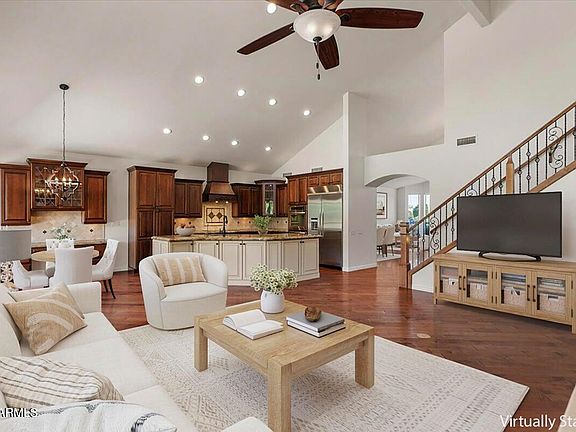 Fall in love with this home in a park like setting. A .37 acre lot is one of the largest in area. Spacious living and dining, custom stair railing, and a beautiful indoor fireplace. Two AC units replaced in 2018 and roof redone in 2018. Five large bedrooms, a spectacular custom kitchen with two tone cabinetry and granite tops. Split primary on first floor with dual walk-in closets and 5-piece bath. Backyard with grass, shade and citrus trees. Cool off in the pool and relax in the hot tub. Gas fire pit with large sitting area and solar lighting. Entertain on the large patio and pool deck. There is a separate garden area and shed. Pull-thru 4th garage has ac and can be a man cave, she shed, gym or storage! Built-in Barbecue and 3 car garage has AC. Scottsdale Address, PV Schools.
