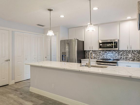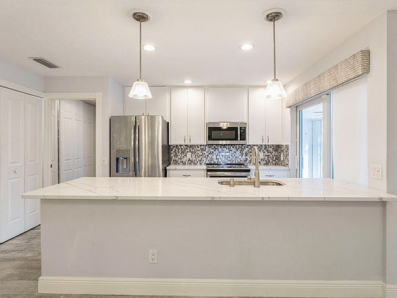 Price-repositioning ! Welcome to this impeccably renovated 2 bedroom, 2 baths townhouse, where no expense was spared to achieve the ultimate in luxury & quality. The enclosed front patio offers ample space for patio table, summer kitchen, all secured with Wingard hurricane impact sliders with secondary locks, Impact protection awning in 2nd bathroom, Impact accordion shutters for added peace of mind & energy-efficient savings. AC unit replaced in 2019, water heater 2014. Inside, ample storage awaits with well-placed cabinets & a dedicated utility closet on the patio, ensuring both convenience & organization. Kitchen offers stainless steel appliances, newer Calacatta Quarts counter tops. Both bathrooms display Quartz counter tops & new tile as well as faucets, toilettes & light fixtures The 2 bathrooms are equally impressive, with modern upgrades that highlight both form and function.