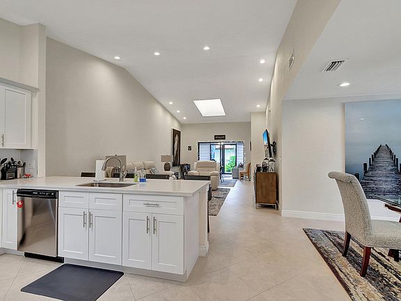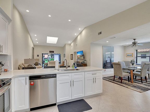 Motivated sellers have adjusted the asking price on this villa for the buyer looking for a completely renovated (2020) 2 bedroom 2 bath plus den and air conditioned Florida Room villa with a one car garage. As you step into the foyer you find a light and bright wide open floorplan with catherdral ceilings and sky lights. The eat-in kitchen has white oak shaker kitchen cabinets, quartz countertops, subway tile backspash, and stainless steel appliances. The den is currently being used as a dining room. The great room fills the open concept space with room for a game table as well. The Florida room is air conditioned can be used as extra sleeping space for guests as well. It opens to a private patio in the rear. The large master bedroom is equipped with two walk-in closets and a niche for a desk if you desire.The master bath has the shaker wood vanity with a quartz countertop and a beautifully tiled shower. The tile flooring runs throughout the house with luxury vinyl flooring in the bedrooms. There is a large pantry and a large storage closet in the hallway that leads to the guest room and hall bath. The hall bath also has a matching vanity with a quartz countertop. The air conditioner is 4 years old. There is a separate laundry room which leads to the garage. All of the windows and sliding doors are hurricane impact. The landscaping around the villa was recently redone. The recently renovated community clubhouse offers indoor and outdoor pools, spa, sauna, billiards, tennis, pickelball, card rooms, arts and crafts, theater, and fitness center and cafe. There are always something to do and friends to join in Huntington Pointe.