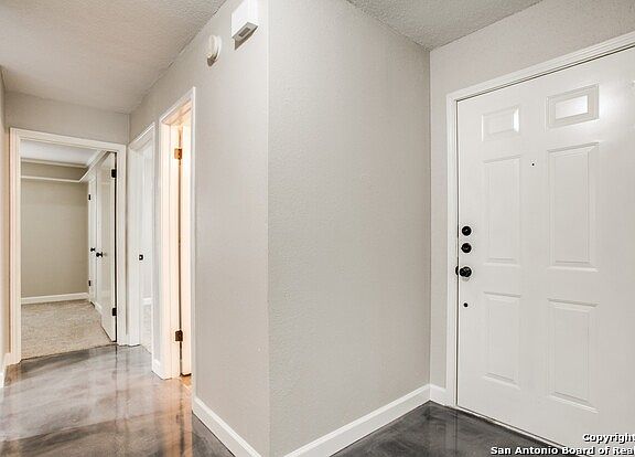 Beautifully updated single-story home in the desirable Apple Creek community! This move-in-ready gem offers the perfect blend of comfort and convenience-just minutes from major highways, the Medical Center, USAA, UTSA, and premier shopping and dining. Inside, you'll find stunning stained concrete floors, vaulted ceilings, and abundant natural light flowing throughout the open layout. The spacious living room features a charming fireplace, while the fabulous kitchen at the heart of the home boasts elegant granite countertops, black appliances, and a convenient breakfast bar. The private master suite includes a walk-in closet and full en-suite bath, offering a relaxing retreat. Outside, enjoy a patio slab perfect for entertaining, a storage shed, mature trees, and a full privacy fence.