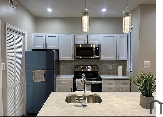 Quartz countertopsNewly renovated kitchenTree-lined streetNew energy-efficient windowsRecessed lightingDecorative exposed brickPlenty of natural sunlight