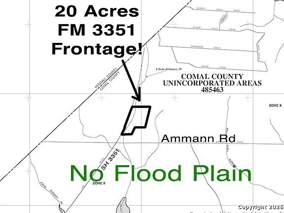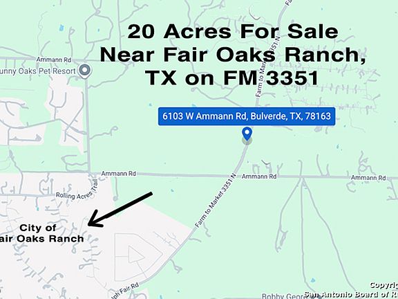 Fair Oaks Ranch Tx area - LOOK! NEW Price - Reduced price on 20 acres! New Price: Now $125k/acre. Unrestricted AG exempt, gently sloping 20 acre tract on Ralph Fair Rd, FM 3351 with 1,500 +/- frontage. No zoning, No deed restrictions and No HOA. High visibility commercial/residential land on FM 3351. 20, 10, & 5 acre sections may be available individually. Located in fast growing Comal County TX. Possible commercial land uses may include RV/Boat storage, industrial flex space, public storage, equestrian ranch, veterinarian, residential ranch home, etc. Comal County Urban Development Rules. Affluent growth area just 5 minutes to Fair Oaks Ranch, 13 minutes to Cordillera Ranch, 18 minutes to Bulverde, 10 minutes to Boerne 25 minutes to San Antonio Airport, Riverwalk & Alamo. No utilities on site, well & septic OK. Rare find in the Hill Country.
