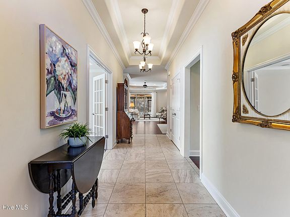 Beautifully maintained brick home in the coveted neighborhood of the Village at Motts Landing. Nestled on a peaceful tree-lined homesite that offers exceptional privacy and wooded views, this single-level, 3 bedroom, 3 full bath residence exudes timeless craftsmanship, low maintenance design, and thoughtful attention to detail--all enhanced by a 2024 Generac generator and HOA included yard maintenance for added convenience and piece of mind. Inside, you'll find an open floor plan with showstopping Brazilian cherry engineered wood flooring, an elegant designated dining space, and a refined home office with a coffered ceiling and custom built-ins, making the perfect place to showcase your favorite pieces. The spacious living room features a tray ceiling with soft recessed perimeter lighting, a cozy fireplace tucked in between built-ins and a wet bar--creating the perfect space for every day living and entertaining. The kitchen is both stylish and functional, featuring tall, soft-close wood cabinetry, stainless appliances, neutral granite countertops, and windows that fill the space with natural light. The primary bedroom suite includes two nice-sized walk-in closets with upgraded shelving and an expansive en suite bathroom complete with tile flooring, dual vanities with granite countertops, generous cabinet storage and a large tile walk-in shower. Step outside to the beautiful lanai, featuring an outdoor kitchen, perfect for year round enjoyment and effortless outdoor living! This desirable community offers multiple clubhouses and pools, along with tennis, pickleball, fitness center, sidewalks and a vibrant calendar of social events--all in an unbeatable location just 15-20 minutes from Carolina Beach and historic downtown Wilmington. Discover the ease of coastal, low maintenance living in this stunning home!