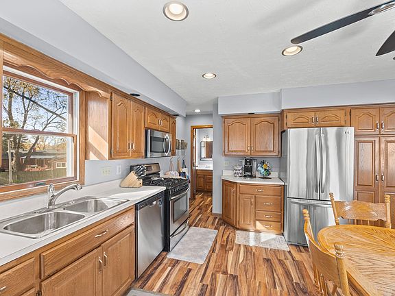 Welcome to this beautifully maintained 3-bedroom, 3-bath rambler located on a quiet cul-de-sac in one of Woodbury’s most coveted neighborhoods! From the moment you arrive, you’ll appreciate the home’s curb appeal, peaceful setting, and the convenience of an oversized 4-car garage, perfect for vehicles, hobbies, or extra storage. Step inside to a bright and inviting main level that features gleaming hardwood floors, a spacious kitchen with plenty of counter space and cabinetry, and a gorgeous bay window that floods the living area with natural light. The main floor also includes three generous bedrooms and two bathrooms, with the oversized primary suite offering two walk-in closets and ample space to unwind at the end of the day. The walkout lower level offers an incredible equity-building opportunity. It’s already equipped with a kitchenette and full bathroom, making it ideal for future expansion, whether you’re dreaming of a guest suite, family recreation room, home office, or entertainment space. Step outside to your own private retreat. The massive backyard is beautifully scenic and perfect for pets, kids, gardening, or simply relaxing outdoors. The 30’x13’ patio provides an ideal spot for grilling, hosting family and friends, or enjoying a peaceful morning coffee. Recent updates include a new roof (2021) and drain tile with sump pump (2025) for added peace of mind. This home combines comfort, convenience, and charm in one affordable package. This is more than a home - it's a lifestyle. Schedule your private showing today and come see all that this Woodbury gem has to offer!