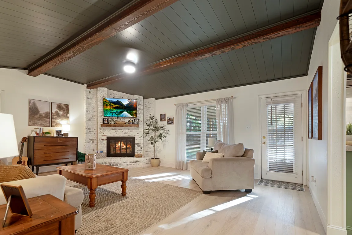 Modern fixtures and finishesBeautiful brick fireplaceWarm inviting color paletteFloating shelvesAntique dresserBeautiful natural lightBeautiful backsplash tile