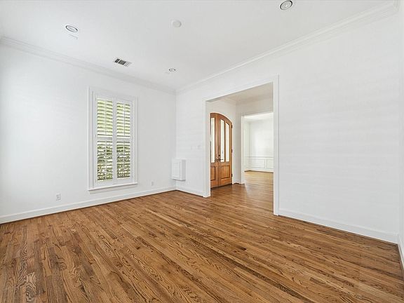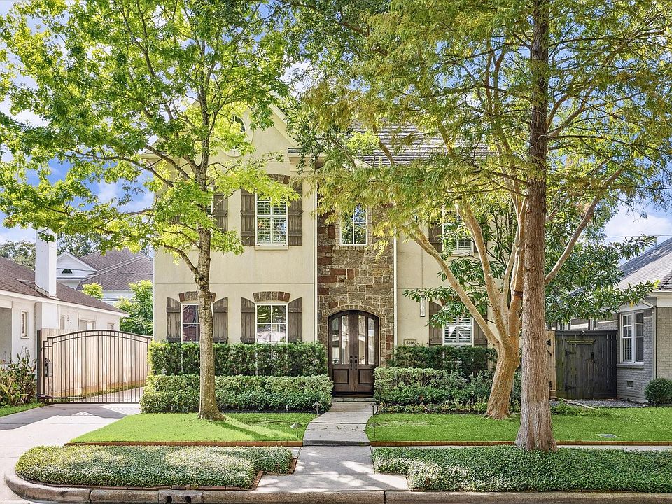 Nestled on a tree-lined block in West University this refined residence boasts a stone & stucco facade. Beautiful hardwood floors flow through the main living areas, with wainscoting in the dining room and a stone-surround gas fireplace in the family room. The kitchen features granite countertops, stone backsplash, and premium appliances including a Thermador cooktop, KitchenAid oven, LG microwave, Frigidaire refrigerator, and Bosch dishwasher. Upstairs, the primary suite offers a tray ceiling, dual closets, and an adjoining study with built-ins. The spa-inspired bath includes marble floors, sleek counters, soaking tub, and separate shower. Secondary bedrooms share a Jack-and-Jill bath with stone counters and an additional full bath with a walk-in shower. A utility room with sink and storage adds convenience. The private backyard offers a sparkling pool, flagstone patio, and gated drive—perfect for relaxed living and entertaining.
