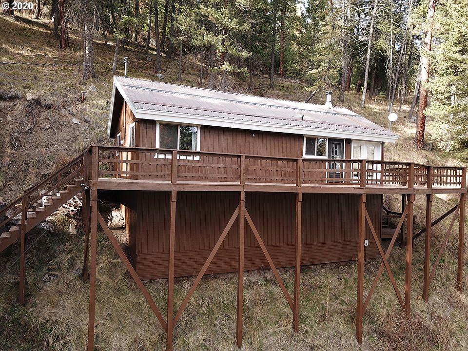 Unique 2 bed, 1 bath house at Wallowa Lake. .39 acre lot. Large 760 sf deck is great for entertaining and enjoying the beautiful lake and mountain views. Rustic cabin feel inside. Open living and kitchen area with French doors open that from dining area onto the deck. Great LT or vacation rental. 1/6 ownership of lake front dock. Decking boards replaced/coated nonstick coating; house and deck rails repainted summer 2019. Lower level crawlspace/basement area for storage.