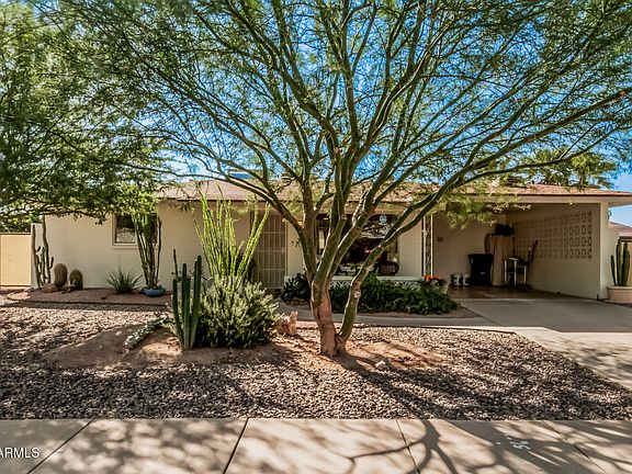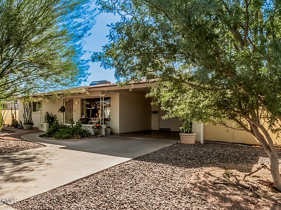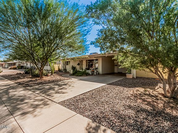 When walking up to this beautifully landscaped home you will appreciate the shade it provides while relaxing on your front porch. Recently painted outside giving it that fresh look! The big 3 (Windows/Roof/HVAC) have been updated just over 5 years ago & the current owners have added a block wall giving you privacy & RV parking in your back yard. A new shed has also been added for that extra storage needed. New SS appliances and updated bathroom top off your new 2 bedroom 1.25 bath home. The AZ room could be used as an office /family room or even a formal dining room. Located in the 55+ community of Dreamland Villa's which has no HOA but offers an optional membership giving you access to wonderful amenities including heated pools, woodworking, pickleball & more!