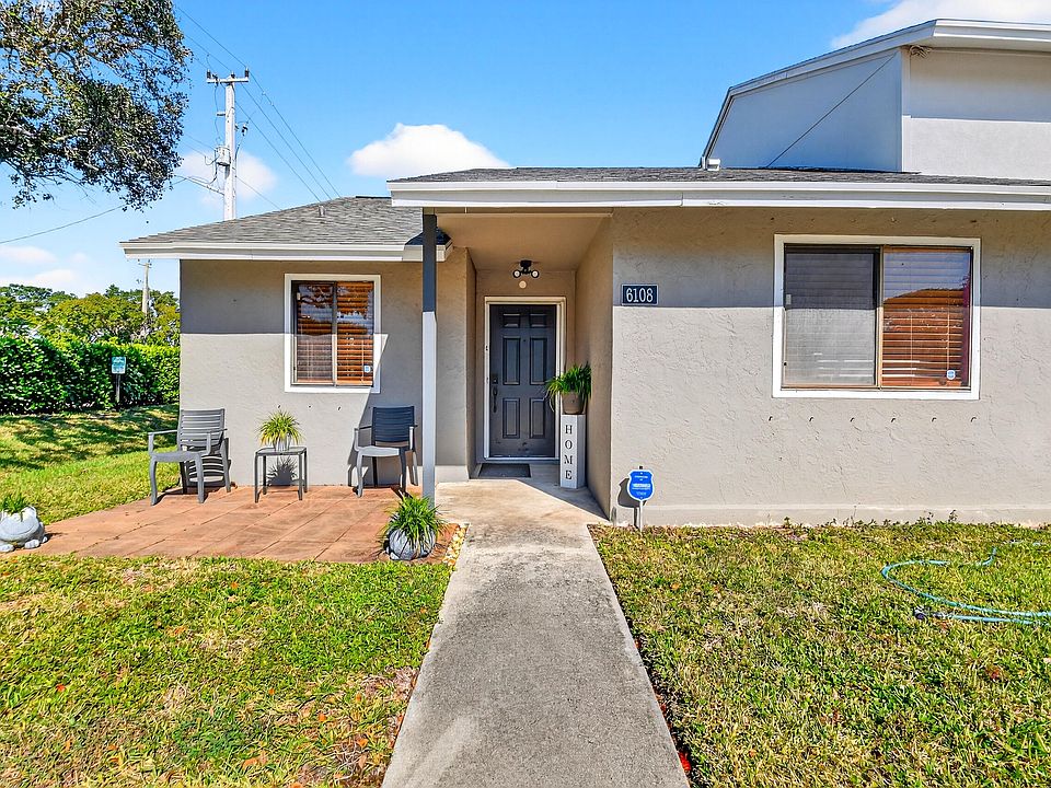 Beautiful upgraded end unit townhouse in centrally located community. As you enter this home, you will notice that it is meticulously maintained and features updated kitchen with high hat lighting, new cabinets and granite counter tops. The kitchen opens into the dining/living space which leads out to the screened patio. This end unit offers added privacy, which is great for entertaining Both bathrooms have been nicely renovated. It is tiled throughout with both bedrooms featuring large closets and ceiling fans. The community offers a pool, which is being renovated, as well as tennis/pickleball courts and a large club house. The unit has a front patio and a back screened in patio. The roof was replaced in 2023. Furniture is negotiable. TVs do not convey.