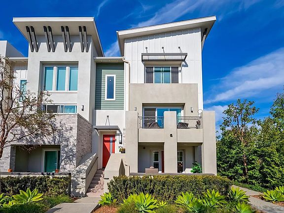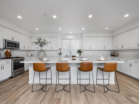 Introducing this exquisite Bressi Ranch largest floor plan, tri-level townhome, nestled in the coveted Kensington at the Square community adjacent to Bressi Village shopping. This end unit townhome is light and bright with large windows and coastal breezes. Located on quiet corner in the sought after Kensington at the Square community. This impeccably appointed home has so many upgrades, including owned solar, air conditioning, smart home features, tankless water heater, EV charger hook-up, epoxy garage floors, upgraded carpet in bedrooms and stairs, wood look tile floors in the kitchen and family room and entrance, and upgraded luxury vinyl in the first floor bedroom, LED lighting with dimmers, and more. There is a first-floor bedroom, 1/2 bath and glass slider to a private patio spacious enough for a grill and seating area. There are 9 ft ceilings throughout the home and a spacious oversized attached 2 -car garage. The second floor boasts a generously sized living area, showcasing a bright and modern kitchen with recessed LED lighting, upgraded cabinets and quartz countertops, stainless steel appliances, a walk-in pantry, and an oversized island perfect for everyday use or entertaining guests. The expansive and inviting great room has natural sunlight through-out the day, and a glass slider extends the living area to an exterior patio, where friends and family can enjoy daytime or sunset views. On the third floor, the primary bedroom has tons of space and natural light, with an ensuite (see sup)