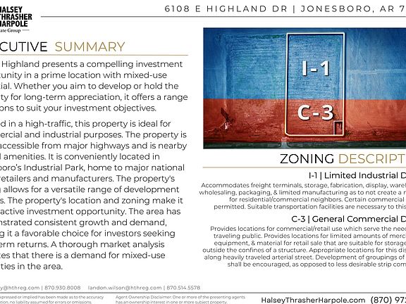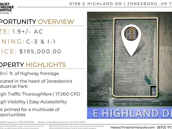 6108 E Highland presents a compelling investment opportunity in a prime location with mixed-use potential. Whether you aim to develop or hold the property for long-term appreciation, it offers a range of options to suit your investment objectives. Located in a high-traffic, this property is ideal for commercial and industrial purposes. The property is easily accessible from major highways and is nearby several amenities. It is conveniently located in Jonesboro’s Industrial Park, home to major national chain retailers and manufacturers. The property's zoning allows for a versatile range of development options. The property's location and zoning make it an attractive investment opportunity. The area has demonstrated consistent growth and demand, making it a favorable choice for investors seeking long-term returns. A thorough market analysis indicates that there is a demand for mixed-use properties in the area.