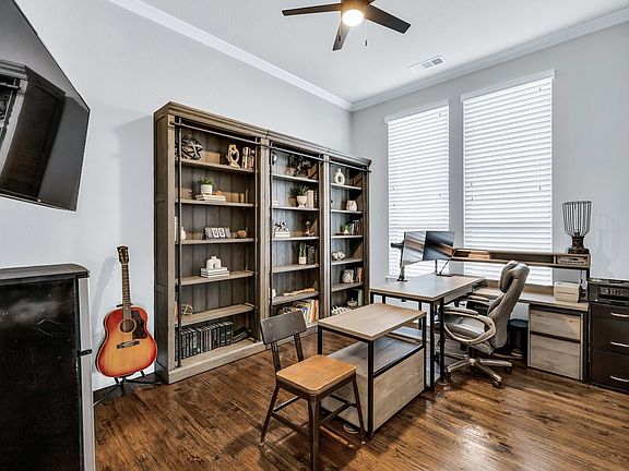 This stunning Highland Home in Canyon Falls is located in the highly sought after Argyle ISD and offers exceptional design, comfort, and views. Hand scraped hardwood floors flow throughout the first level, leading to a gourmet kitchen with stainless steel appliances, custom cabinetry, spice racks built into the vent hood, a farmhouse sink, gas range, and a large walk-in pantry. The kitchen opens to a spacious living area with a gorgeous stone fireplace, perfect for relaxing or entertaining. Expansive windows with plantation shutters fill the home with natural light and frame serene views of the large pond behind the property. The primary suite features bay windows overlooking the pond, a spa-like ensuite bath, and a generous walk-in closet. A private guest suite with its own bath and walk-in closet is also on the first floor. Upstairs offers a large game room, a media room with bar area, a half bath for guests, and two additional bedrooms with walk-in closets, plus a versatile bonus nook for study or play. Step outside to the covered patio and enjoy a peaceful outdoor living space with beautiful water views. A charming custom covered garden on the side of the home provides the perfect spot for anyone with a green thumb to grow herbs, flowers, or vegetables year-round. Community amenities include scenic trails, pools, parks, and a clubhouse, all in a beautifully maintained master-planned neighborhood.