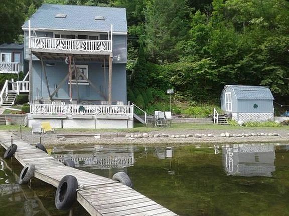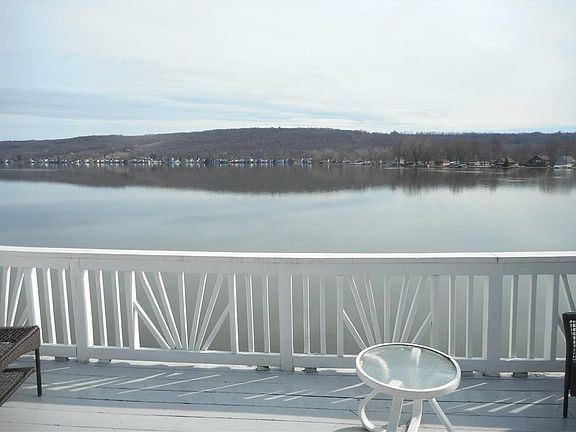 Very rare & sweet money making opportunity on west side of Conesus Lake. A gorgeous 1,560 sqft duplex w/ 3 bdrms, 2 bath main house and double deck with 154' of water frontage that includes dock and lovely level sand and shale beach. A legal studio in the basement gives you continuous income Main house rents at $1,400/week ($2400 during July 3 week) during summer; $1080/mo. during winter AND the studio brings in $5,700/year. Studio tenant has been there 11+ years. Do the math- $33,620 GAI. Or, live in main house & get the STAR exemption while enjoying lake life all year round. All separate utilities. Parking for at least 7 cars. Roof & siding, 2011. No flood insurance needed. Flood elevation done!