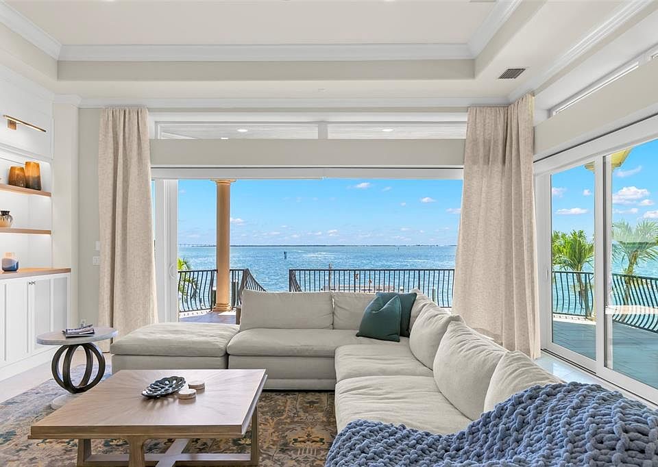 Welcome to an unparalleled sanctuary of luxury and elegance, positioned majestically on Florida’s Tampa Bay. This commanding estate offers an awe-inspiring tableau of open water views that captivate you the moment you step through the grand double glass and wrought iron doors. As you enter the magnificent formal living area, you're greeted by soaring cathedral ceilings and an inviting cast stone gas fireplace, creating an ambiance that is both impressive and warmly welcoming. Spanning an expansive 7,042 square feet, this palatial abode has been meticulously designed to balance grandeur with the comfort of a home. Recently remodeled to bring the coastal beauty indoors, the home marries elegance with modern coastal aesthetics. Nearly every room is a canvas for breathtaking views, including the brand new designer kitchen. This culinary haven features pristine coastal white cabinetry paired with a contrasting large center island and a breakfast bar, all topped with stunning quartzite stone countertops. Culinary artistry is found in its fabulous blue enamel stove with gas cooktop, complemented by top-of-the-line appliances including dual built-in Thermador refrigerators, two double drawer dishwashers, an ice maker, and a hidden butler’s pantry with additional wine refrigeration. The picturesque family room is a masterpiece of design, offering panoramic views of Tampa Bay through two walls of pocket (hurricane rated) sliding doors that seamlessly blend indoor and outdoor living. Custom crafted shelving and a wide screen complete this space, perfect for relaxation and entertainment. Each of the four generously sized bedrooms features walk-in closets and en-suite baths, providing private retreats for family and guests alike. The main living level hosts a guest suite, a richly paneled office, and a second spacious family room with a bar, adorned with exquisite wall coverings and a large flat-screen TV, creating the ideal setting for movie nights or watching the big game. Completing this level are a formal dining room, a casual dining nook with custom seating, a half bath, and an expansive laundry room. Ascend to the top floor, where the lavish primary suite awaits, featuring a luxurious en-suite bath and two massive walk-in closets equipped with custom closet systems. The opposite wing presents a cozy separate living area for two additional beautiful waterfront bedrooms, each adorned with coastal wall coverings. This estate is as practical as it is beautiful, featuring an exquisite elevator with glass panels for seamless access across all levels, all-new hurricane rated windows and doors, and expansive waterfront decks adorned with designer lighting and architectural mastery. Car enthusiasts will revel in the massive garage on the first level, providing ample space for a fleet of vehicles. The outdoor oasis is a true spectacle, featuring a lagoon-style pool with jacuzzi, a cozy grotto with waterfall, and easy beach entry. The backyard is an entertainer's dream with an enormous tiki bar and a stainless steel outdoor kitchen. With 100 feet of pristine waterfront, a large dock with wet slip ideal for a yacht, a tide slide system, and boat and jet ski lifts, this estate is not just a home, but a lifestyle to be cherished for a lifetime. Experience unparalleled luxury in Florida’s coastal paradise, where every detail has been crafted to create a home that is both a sanctuary and a statement.