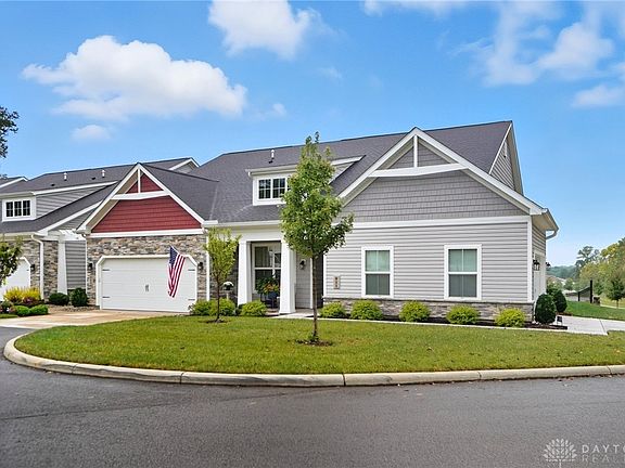 Welcome to the Cottages of Beavercreek! This beautifully designed 3 bed, 2 bath END unit condo offers the perfect blend of comfort, style, and convenience. Built in 2022, the Chesapeake model showcases an open floor plan with soaring 9 ft. ceilings, abundant natural light, and high-end finishes throughout. The gourmet Kitchen features modern maple cabinetry, granite countertops, SS appliances, and a large island-perfect for entertaining. Relax in the spacious Great room(with gas line included for optional fireplace) or step out to your private patio w/ remote-powered awning for a morning coffee or evening unwind. The luxurious owner's suite boasts tray ceiling, a large walk-in closet and spa-like bath with dual vanities and a walk-in shower. Enjoy maintenance-free living with lawn care and snow removal included through the low monthly HOA. A 2 car-attached garage(roughed for EV charger) and ample storage make daily living easy. This energy smart home w/ high efficiency systems & materials is located just minutes from the Greene, Wright-Patt, and major highways, this home offers both peace and accessibility. Common grounds feature lake w/ fountain, green space, sidewalks, benches, private dog park, 3 tiered fountain, and pergola w/ a gas fire pit. Updates: epoxy flooring in garage, larger gutters & downspouts & leaf guards installed, motor-powered awning on back patio. No city income taxes at the Cottages of Beavercreek! Don't miss the opportunity to own in this sought-after community-schedule your showing today!