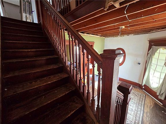 However, some repairs are needed, particularly for the porch roof, which requires additional support and replacement, as well as the garage roof. Some drywall installation and finishing are also necessary. The second floor accommodates two bedrooms and allows for the possibility of a third bedroom if desired. The finished attic space can also serve as an additional bedroom. There is one bathroom on both the first and second floors, and the laundry is located on the first floor.