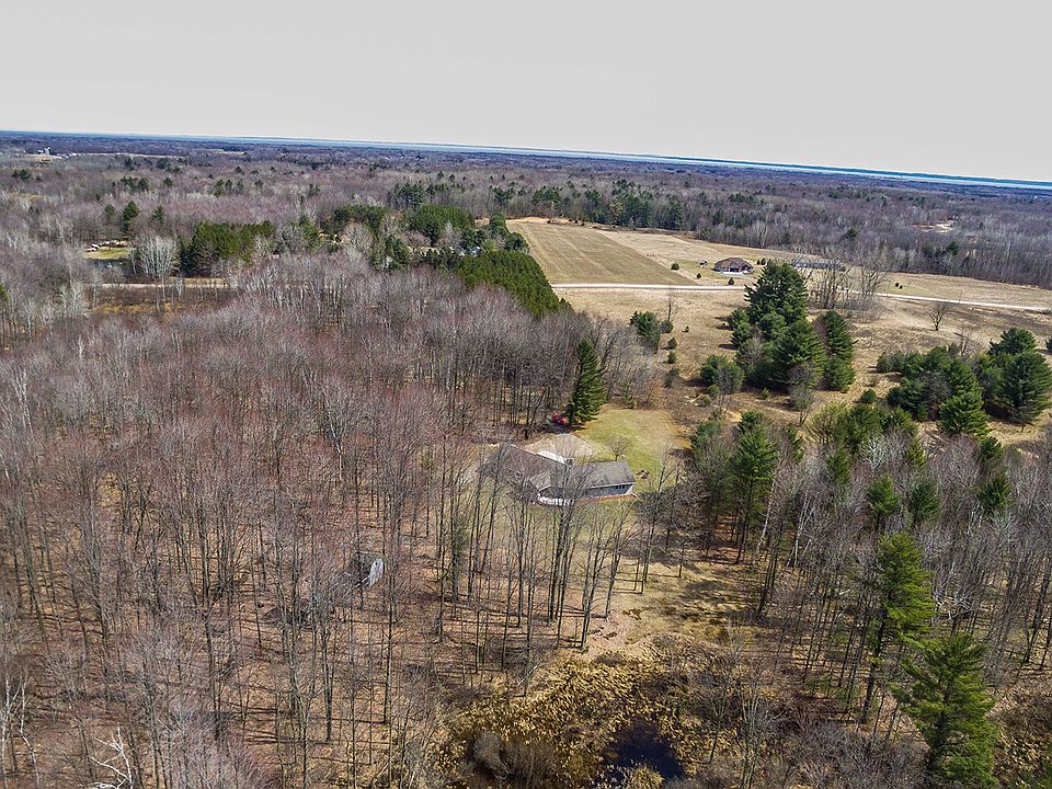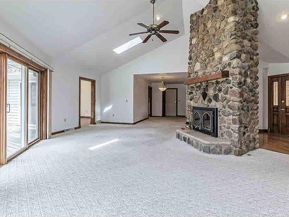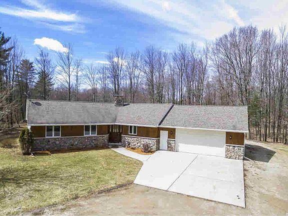 Private 6 ac wooded setting! Open concept living room w/cathedral ceiling, full masonry fieldstone fireplace & doors to deck overlooking the wooded backdrop. French doors lead to the 4 season room w/new hardwood flooring & doors to deck. Kitchen offers an abundance of cabinets. Master w/trey ceiling & huge walk-in closet. 1st floor laundry. 2.5 car attached garage w/basement access. Garden shed.