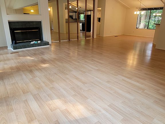 Laminate flooring in living, dining, kitchen, hallway, and one bedroom