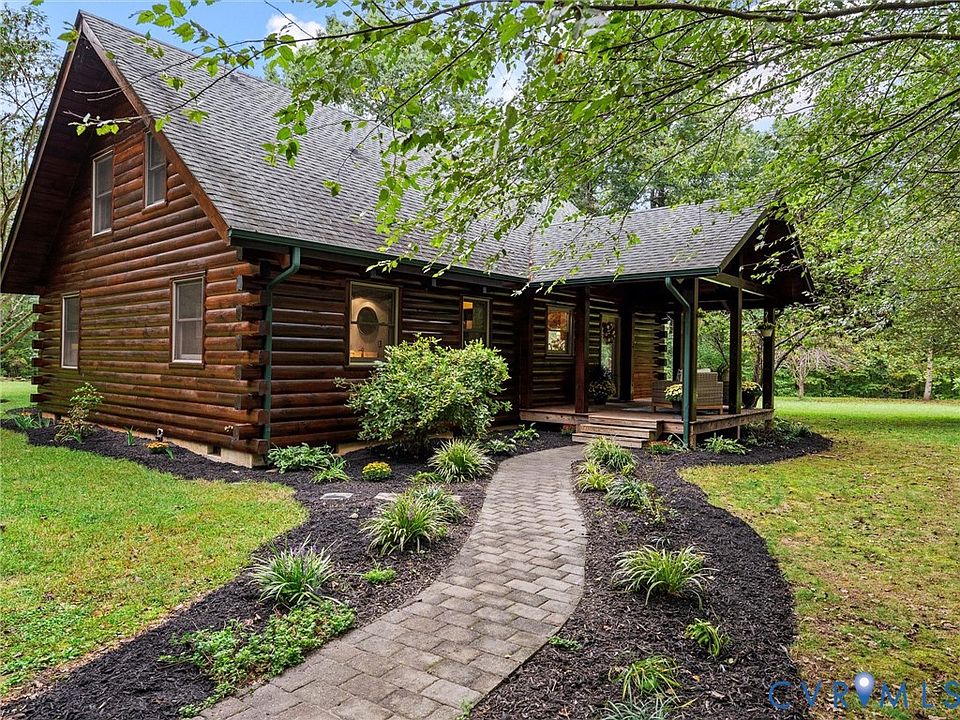 Custom built log cabinGas fireplaceFull private bathReal log wallsPrivate drivewayMature landscapingCovered front porch