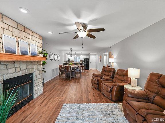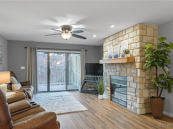 Your search for BIG space, BIG deck, and BIG value at Lake of the Ozarks stops here. This 1,670 sq ft, 3-bedroom, 2.5-bath Lazy Days condo delivers rare size and lake access inside Lake of the Ozarks State Park. Turn-key and fully furnished, the décor, layout, and updates are ideal for owners who want a ready-to-enjoy lake place where vacation rentals are allowed and the styling is spot-on for strong guest appeal. New LVP flooring, stainless appliances, an open kitchen with breakfast bar, dining area, and a stone fireplace anchor the main level. The oversized covered deck expands your living space and includes a large storage closet for lake gear. Enjoy cove-protected water with wooded state-park shoreline and a 10×30 slip in the community dock with Wet Steps and fish-cleaning stations. Lazy Days amenities include two lakeside pools, grilling pavilions, playgrounds, a lakeside boardwalk, trailer parking, and swim access at the docks. Deep water, calm cove, and excellent access to Dog Days, Wobbly Boot BBQ, State Park Marina, The Oaks Golf Course, Lake Regional Hospital, dining, shopping, and Hwy 54. A hard-to-find, large-format condo in a prime Osage Beach location.