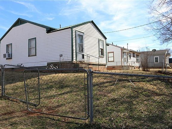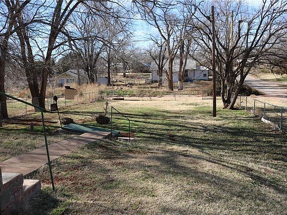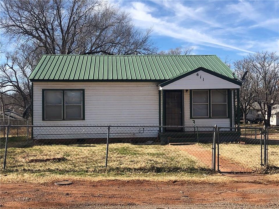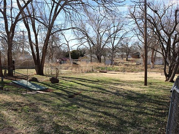 Great starter home has big backyard with chain link fence all around does have a storm cellar. House has a metal roof and corner lot and shade trees . Has wood laminate & some linoleum floors. Comes with refrigerator and stove. Bathroom has a tub and shower combo. Closets you can walk through to the other bedroom.