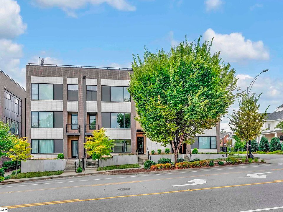 Welcome to 611 North Main Street, Unit 9 at NOMA City Terrace - a beautiful 4-story townhome nestled in downtown Greenville’s highly coveted North Main neighborhood near McPherson Park and a short distance to NOMA Square, Falls Park, the Peace Center and the city’s best dining, shopping and cultural activities. Built in 2021, this exceptional home has a prime location on North Main Street, offering wonderful views of downtown Greenville and the North Main neighborhood. Thoughtfully designed for both comfort, functionality and entertaining, this residence features a 2-car attached garage, two spacious bedrooms - each with its own en-suite bathroom, plus an additional powder room for guests. A private elevator services all four floors, leading to a stunning rooftop deck with expansive views – providing an ideal space for relaxing evenings or entertaining friends and family. The well-maintained home is finished with hardwood floors throughout all living areas, while the bathrooms feature stylish designer tile floors. There are beautiful, designer light fixtures, upgraded plumbing fixtures and other sophisticated, designer touches throughout. The first floor is accessible via a front North Main Street access or via the attached rear 2-car garage. It features a welcoming foyer with glass front main door, wide-plank wood floors and a wood stairway with iron railings leading to the second level. The open-concept second level boasts soaring 10-foot ceilings and expansive windows that flood the space with natural light and offer peaceful views of mature trees on North Main Street. The gourmet kitchen is a chef’s dream, outfitted with premium stainless steel Bosch appliances including a 5-burner gas cooktop and hood, French door refrigerator, built-in microwave, dishwasher and disposal, quartz countertops, upgraded herringbone ceramic tile backsplash, custom cabinetry with soft-close drawers, upgraded hardware and plumbing fixtures, a walk-in pantry, and a large island perfect for gathering or dining. The dining area features an exquisite, modern chandelier, custom built-in cabinetry with a wooden countertop, floating shelving and accent lighting on a beautiful, tiled wall. The living room area features a fireplace with custom tile surround, custom built-in bookshelves with storage drawers and plenty of room for relaxing or entertaining. A conveniently-located powder room with designer-sourced tile wall and custom vanity completes the main level. The third level features a luxurious primary suite with a double quartz-top vanity, expansive dual-head glass-enclosed shower with exquisite, designer tile, a separate water closet with custom built-in linen closet, plus a spacious walk-in closet with custom organizers. An additional bedroom with walk-in closet and full bath with quartz-topped vanity and tub/shower combination with subway tile surround is accessible via the bedroom or the hall. A full laundry area is also located on this level. The top level not only includes the expansive rooftop deck offering views of the Greenville skyline, but there is also a bar area with beverage refrigerator, subway tile wall, quartz countertops and custom cabinetry – perfect for entertaining. Whether you're looking for your forever home or a luxurious in-town retreat, this one-of-a-kind townhome delivers on every level. This one-owner home has numerous upgrades and updates since purchase and has a definite WOW factor! Zoned for award-winning Stone Elementary, League Middle and Greenville High School. Don’t miss your chance to own this amazing townhome in the heart of Greenville!