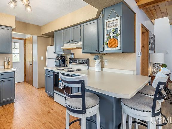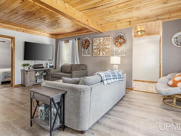 Updated modern farmhouse chic! This nice 2 bedroom, 1 bath charmer sits on a spacious lot just a stone's throw from Strawberry Lake and the large park. Features include a large front porch, central air, beautiful tongue-and-groove ceiling in the entry and living room, kitchen breakfast bar, and first floor bath with linen closet. The full basement is clean and offers a laundry area plus ample storage options. Updates include Lifeproof vinyl flooring, newer carpeting, and new roof sheeting and shingles in 2023. But let's step outside, shall we? Check out the incredible 36x36 insulated garage that boasts a gas furnace, tall ceilings, car hoist, 2 overhead doors (on back and side), 200 amp electrical service, plus cold storage in the attic, with stairs on a winch system for access. Plenty of room for all your toys, projects, and more!