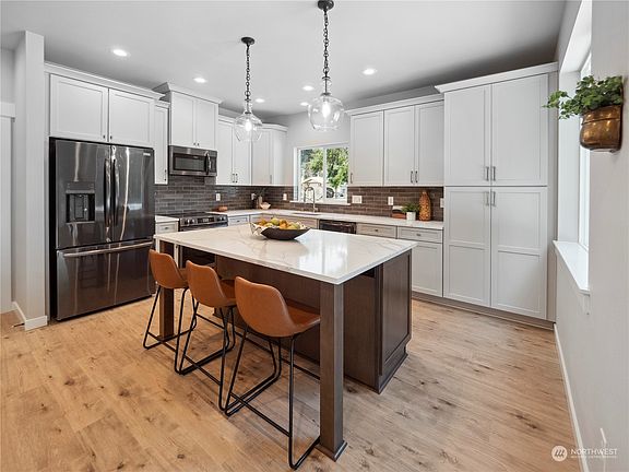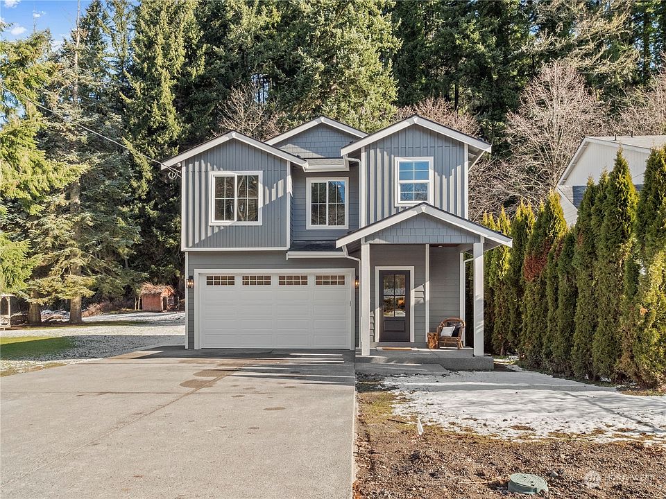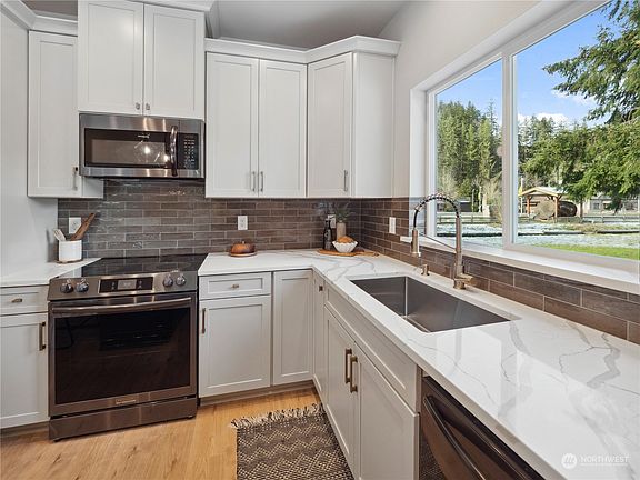 New construction alert in Wilkeson! 1,684 SF 3 bedroom, 2.25 bath w/ insulated 2-car attached garage and plenty of off-street parking that backs to forest lands. Waterproof flooring throughout the main w/ well-appointed kitchen, slab Quartz countertops, island bar seating, dining area & slider to back patio. Half bath downstairs w/ quartz countertops. Owner's suite w/ private bath, tile floor, linen cab & Quartz countertops on the huge dual sink vanity. Large walk-in closet off of primary bath. Guest full bath & utility room up plus 2 more good sized bedrooms w/ insulated interior walls upstairs for quieter spaces. Hardi-plank siding. Forced air/mini-split heat pump and AC system. Walking distance to downtown Wilkeson shops & restaurants.