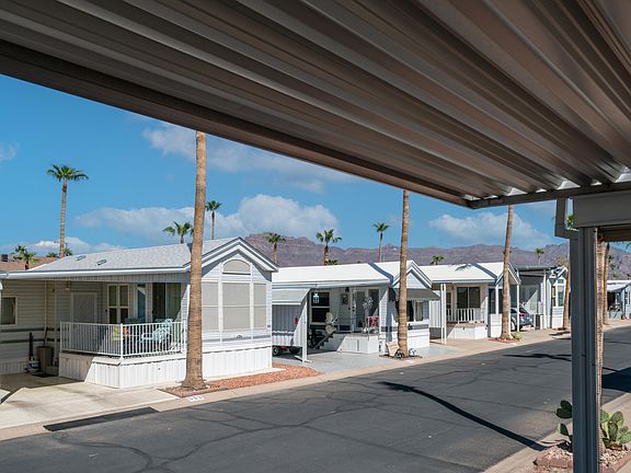 This beautifully maintained home with an Arizona room on the same level as the park model is a must see. Step onto the impressive front tile deck and take in the breathtaking views of the Superstition Mountains! Inside, you'll find updated wood look laminate flooring throughout, dual-pane tinted windows, vaulted ceilings, ceiling fans, and skylights that fill the home with natural light. The kitchen features a spacious front dining area with a table that expands for larger gatherings, plus a wraparound counter with extra cabinets for serving and storage. Appliances include a built-in microwave, RO unit, garbage disposal, dishwasher, pantry, and refrigerator. The Arizona room adds even more living space, complete with a large storage closet, full size washer and dryer, and a second refrigerator.