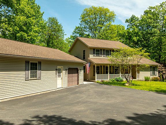 8.2 Acres of privacy await you with this 2,360 square foot home with partially finished basement, open and covered rear decks, covered breezeway and huge 3 car garage! Primary bedroom suite and laundry on the first floor provides 1 level living and the simple addition of a wall would provide 2 private bedrooms on the 2nd floor (currently 1 bedroom, and another large open room) along with the full bath. Private setting but not too far from town!