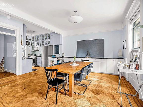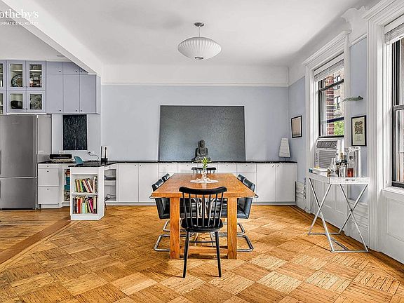 The apartment retains its original charm, with hardwood floors and exquisite prewar details throughout, complemented by oversized windows in every room. The chef’s kitchen is a highlight, featuring one-of-a-kind stone and marble countertops, restored original cabinetry, and brand-new Bosch appliances, including a dishwasher and stove.