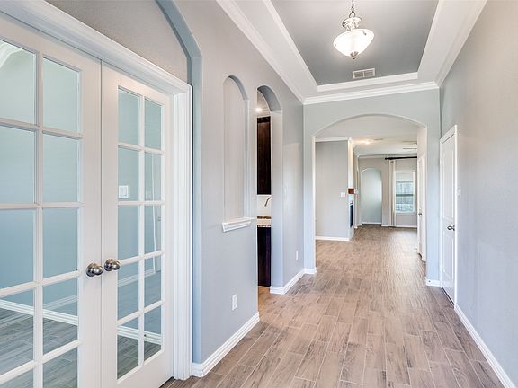 Located in the prestigious Prosper ISD, this move-in-ready single-story French Country home features a spacious private office with French doors, custom blinds, and elegant window coverings. The open-concept kitchen boasts granite countertops, a gas cooktop, a large pantry, and stainless-steel appliances—including a refrigerator that stays. Natural light fills the family room centered around a cozy gas fireplace, while luxury vinyl plank flooring flows through the main living spaces and formal dining room.
