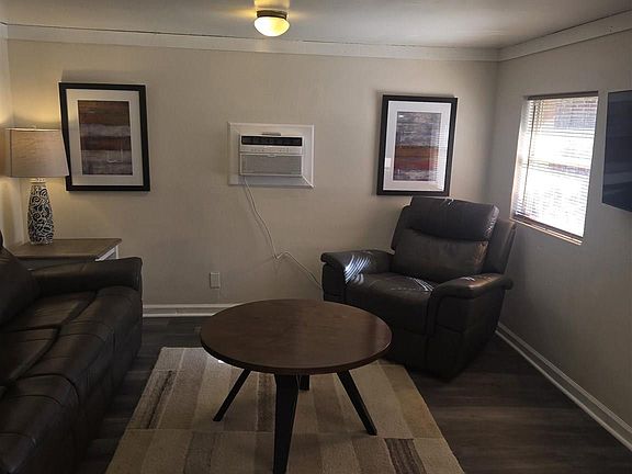 One large bedroom, one bathroom furnished with a large living room, dining area and kitchen with stove and full-sized side by side refrigerator. In addition, this unit comes with a stackable washer and electric dryer. Two window A/C units cool the space with remotes. Space heaters owned and provided by the tenant to be used in the winter for heat. This unit comes with all of the utilities. This includes, electricity, water, trash pickup, sewer, wifi, and seasonal lawncare twice monthly, 9 months of the year.